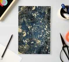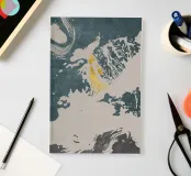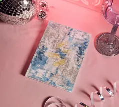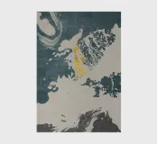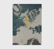 A dynamic, abstract design features swirling patterns in shades of blue, white, and hints of yellow, suggesting a sense of movement and fluidity. Areas of contrasting colors create a striking visual effect reminiscent of natural elements like water and wind.