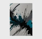 An abstract composition showcases vibrant splashes of teal, black, and gray paint merging in a dynamic arrangement, evoking energy and creativity in a contemporary setting.