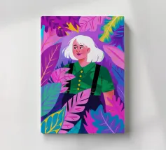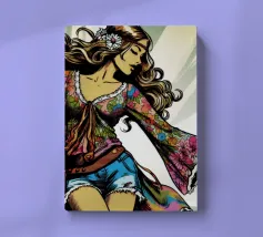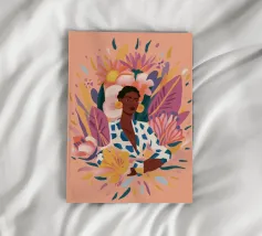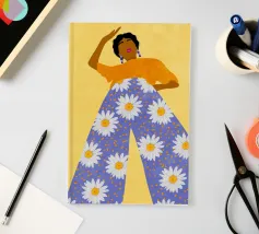 This artwork depicts a person in a vibrant yellow floral top and blue pants, striking a dynamic pose against a pink background with orange floral patterns.