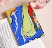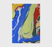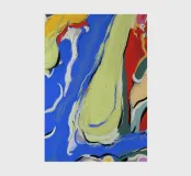 Bold swirls of blue and green intertwine with vibrant red and orange, creating a dynamic and energetic composition. Abstract forms and broad brushstrokes evoke a sense of motion and fluidity