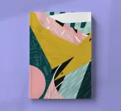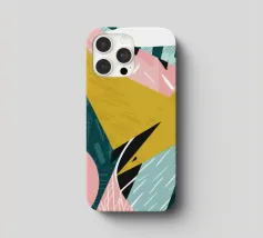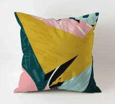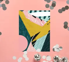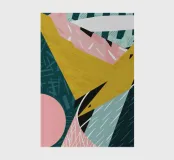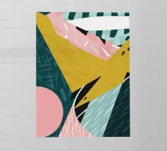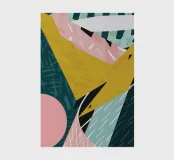 An abstract artwork featuring a dynamic collision of shapes in shades of yellow, green, and black. The sharp angles and overlapping forms create a sense of energetic movement and modern edge.