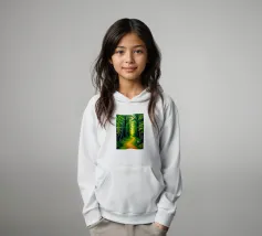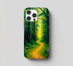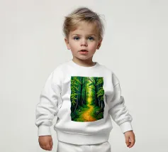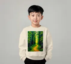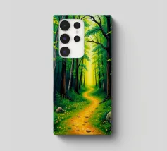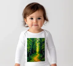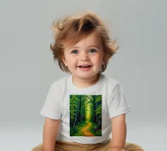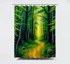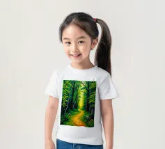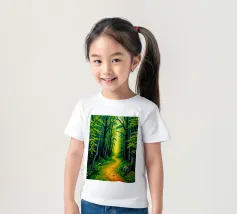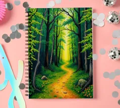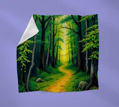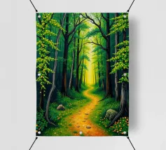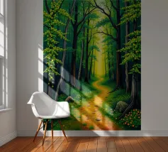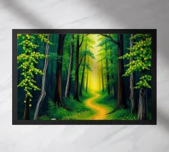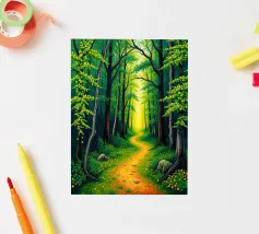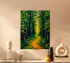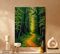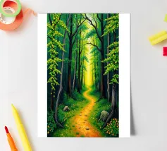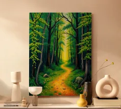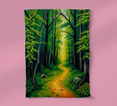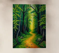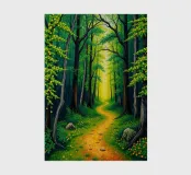 Step into a world of vibrant green with "Enchanted Forest Path," a captivating digital painting that invites you on a tranquil journey. A winding, sun-kissed path of glowing stones leads you deeper into a lush forest, where towering trees with rich, textured bark reach for the sky. The forest floor is a tapestry of vivid emeralds and mossy greens, dotted with delicate wildflowers. Sunlight streams through the canopy, creating a golden, ethereal glow that illuminates the way forward. This piece captures the serene beauty and magical feel of nature, making it a perfect addition for anyone lookin