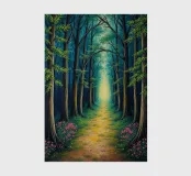 Step into a world of vibrant color and serene light with this captivating piece. This painting depicts a magical forest path winding its way towards a brilliant, glowing clearing. Towering, ancient trees with deep blue and green foliage create a natural archway, guiding the viewer's eye. The sun-dappled trail is lined with patches of delicate wildflowers, adding splashes of pink and purple to the lush, green undergrowth. The ethereal glow at the end of the path draws you deeper into this enchanted scene, promising a sense of hope, wonder, and tranquility. This artwork is perfect for adding a t