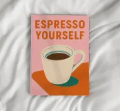 A charming blend of wordplay and design, “Espresso Yourself” invites you to savor self-expression through caffeine and color. A creamy coffee cup with teal sketch accents sits atop a bold orange shadow, all set against a soft pink backdrop. The contrast of warm and cool tones, along with hand-drawn textures, gives the piece a playful and uplifting character. Ideal for kitchens, cafés, or creative corners, this print brews personality with every glance.