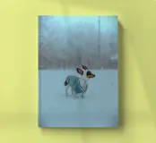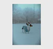 The little dog with pure white fur was walking on the soft snow. On its head, it wore a warm white scarf, rolled up around its ears and forehead, and a blue shirt, looking both cute and warm. Tiny footprints were imprinted on the thin layer of snow, leaving small, pretty trails behind it. Its eyes were sparkling, its tiny black nose was shaking in the cold wind, creating a funny and heartwarming image in the middle of the winter scene.