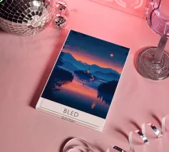 Discover the iconic fairytale scene of Lake Bled, Slovenia, with this stunning digital art print. The image features the famous island with its pilgrimage church and buildings, set against the dramatic backdrop of the Julian Alps. The vibrant blue-green water perfectly reflects the island and the snow-capped mountains. Rendered in a fluid, vintage travel poster style with hints of watercolor, this artwork beautifully captures the alpine tranquility. This premium digital download is provided in an exceptional 7000x5000 pixels resolution at 300 dpi, ensuring superb clarity and vibrant color for