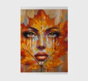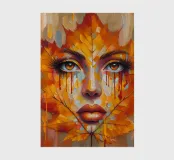 Portrait painting in a striking artistic composition where a woman's face is seamlessly blended with vibrant autumn leaves. The leaves, primarily in hues of orange, yellow, and red, form the contours of her face, creating a mask-like effect.