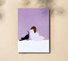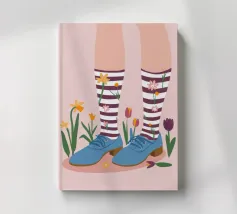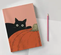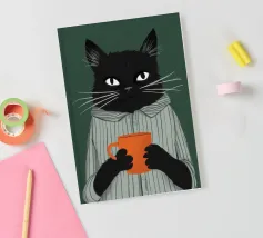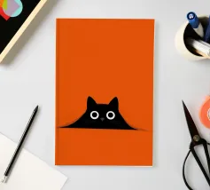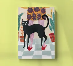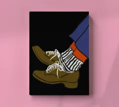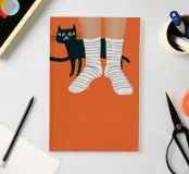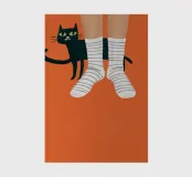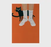 A humorous and charming illustration of a playful black cat attacking the socks on a person's feet. The simple composition against an orange background is a cute, funny, and relatable snapshot of life with a cat.