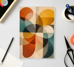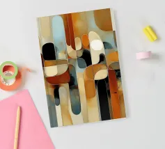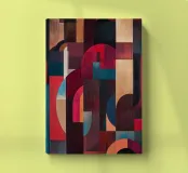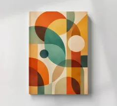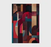 A rich, contemporary abstract composition built from layered geometric forms and deep, atmospheric colour. Curves and blocks intersect in a carefully balanced arrangement, creating a sense of architectural rhythm and visual depth. The surface texture adds a subtle, painterly warmth, softening the geometry and giving the work a tactile, crafted presence.