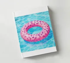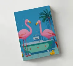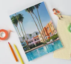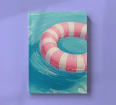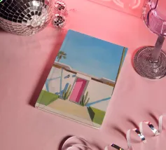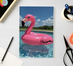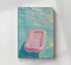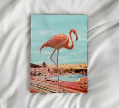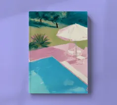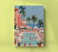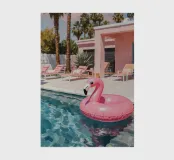 A nostalgic Palm Springs scene: a pink flamingo swim ring drifting in a turquoise pool, framed by soft pastel loungers and towering palms. This artwork brings retro summer spirit, relaxed vacation mood, and mid-century charm to any wall — ideal for living rooms, bedrooms, or stylish poolside decor.