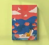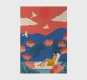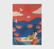 Amid towering coral poppies and feathery palms, a woman reclines peacefully beneath a bold red sun, floating on a pool of quiet. White birds soar across a dreamlike sky, echoing the stillness of her pose. Set against rich indigo mountains and a tangerine sky, the scene captures a surreal harmony between nature and self — a suspended moment where time blooms, and thought dissolves into color and calm.