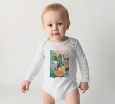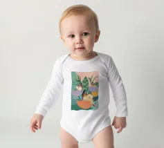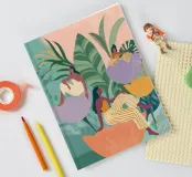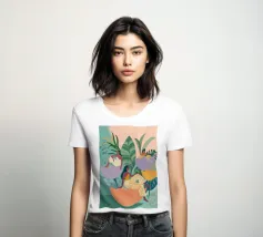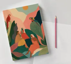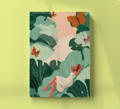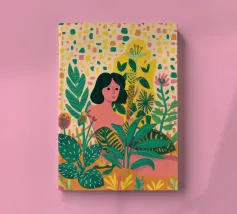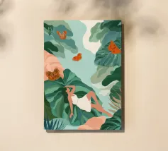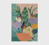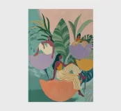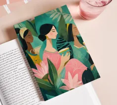 Three women sit peacefully within oversized, blooming flowers surrounded by lush tropical leaves. Each figure is poised in soft contemplation, blending into a dreamlike botanical world that feels both vibrant and serene. The pastel background and bold plant forms create a sense of harmony between nature and femininity.