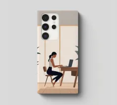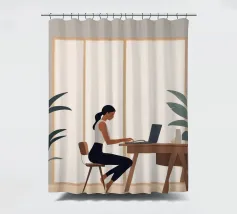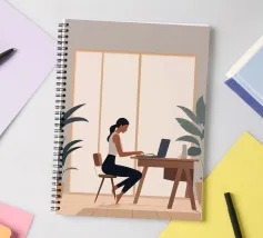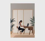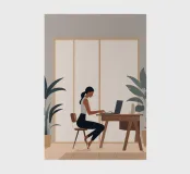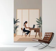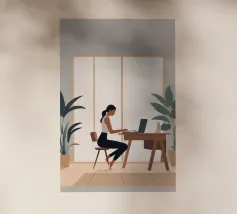 A peaceful office scene featuring a woman working in a bright, plant-filled room. Neutral tones and soft lighting create a productive yet calming atmosphere.