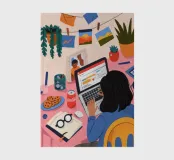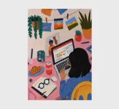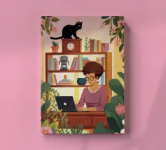 A person works on a laptop surrounded by books, papers, and decorative elements. Plants and a warm ambiance enhance the productive environment.