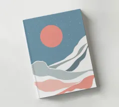 This is a digital illustration of a lost girl in her thoughts. Blue illustration of a girl standing in a surreal mountain landscape in blue and red.