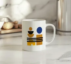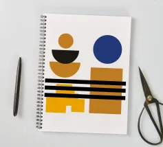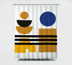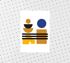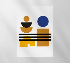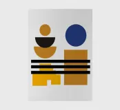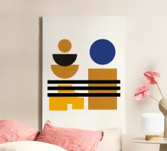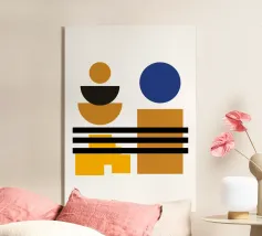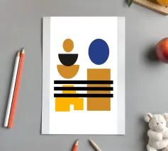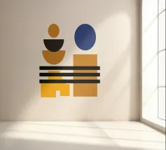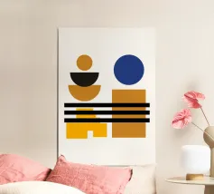 Explore dynamic geometric abstraction with this striking Bauhaus-inspired graphic art print. Featuring a captivating abstract composition of geometric shapes including circles, semicircles, and rectangles in bold colors (yellow, black, blue, brown), arranged in a dynamic abstract design. This artwork embodies the principles of modernist design – form, color, and composition, with a contemporary feel influenced by the Bauhaus movement, highlighting the interplay of geometric forms and vibrant colors. This high-quality digital art file boasts a stunning 7000x5000 pixel resolution at 300 dpi, ens