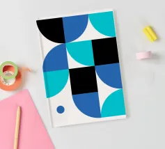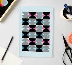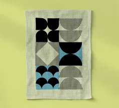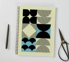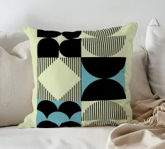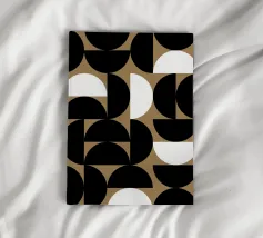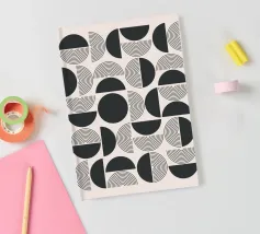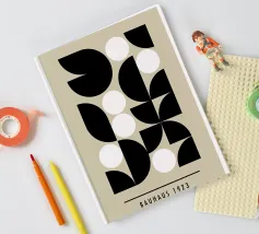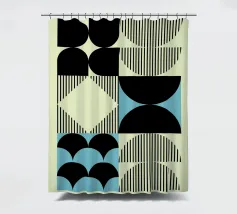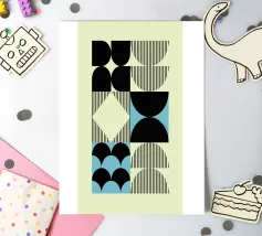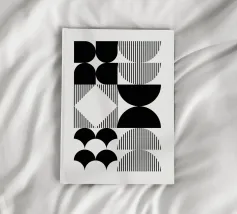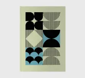 Dynamic geometric abstract art print in Bauhaus style. Features a captivating composition of solid black and striped semi-circles and quarter-circles, combined with areas of light blue, against a light background. Interplay of forms, patterns, and color blocks creates a striking visual. High-quality digital art file (7000x5000px, 300 dpi) perfect for stunning prints. Ideal modern wall art.