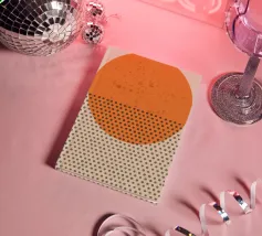 A modern abstract composition of geometric shapes and color blocks in a palette of yellow, black, pink, and orange. The style is balanced and has a retro feel.