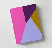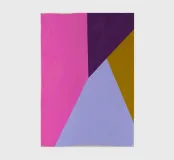 An abstract composition featuring bold geometric shapes in pink, purple, gold, and light blue. The interplay of colors creates a dynamic visual experience.