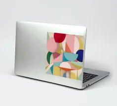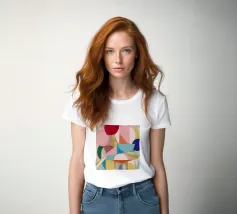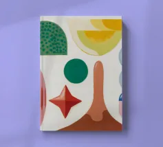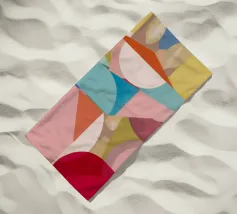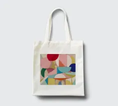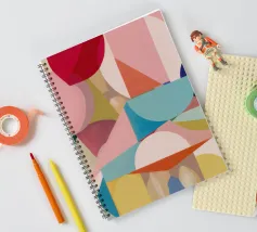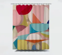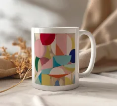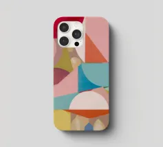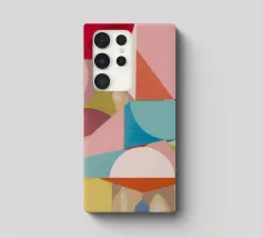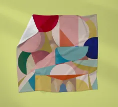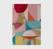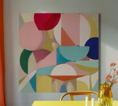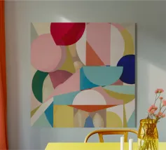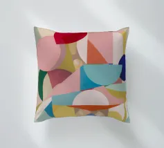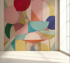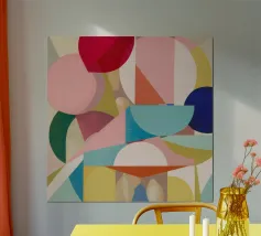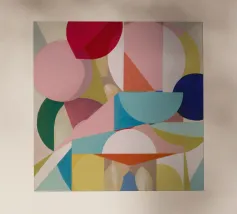 A dynamic abstract composition of overlapping geometric shapes and color fields in a vibrant palette of pink, red, blue, and yellow, creating a sense of depth and energy.