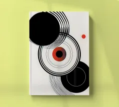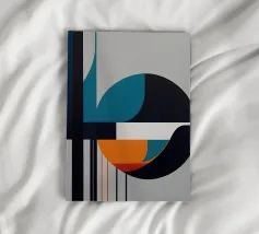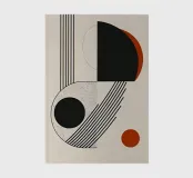 Geometric shapes and lines in black and orange create a harmonious abstract design. A balance of semicircles, circles, and lines brings a dynamic yet minimalist composition. The neutral background enhances the contrast between the bold colors and shapes.