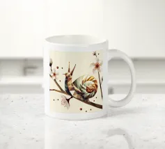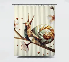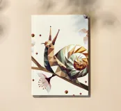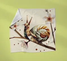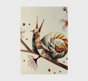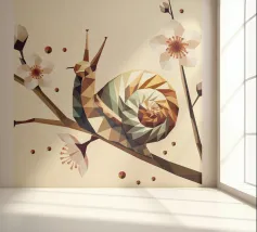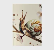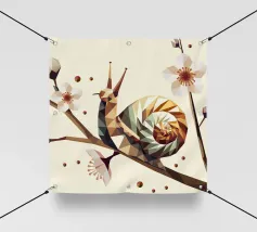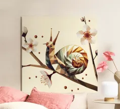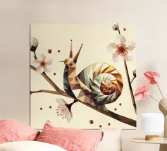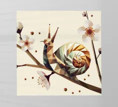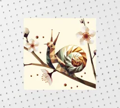 Detailed polygon artwork: a snail on a flowering branch - stylish, close to nature and perfect for modern designs with floral accents. Geometrically stylised snail on a branch With white flowers in a low-poly style Warm natural colours, ideal for print & wall decoration Combination of animal & plant motifs Perfect for themes such as spring & nature