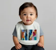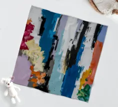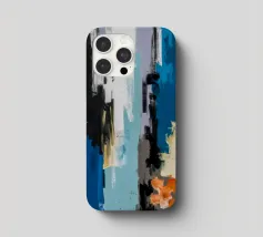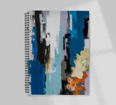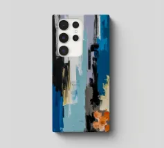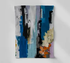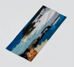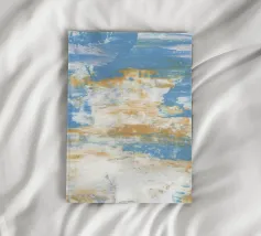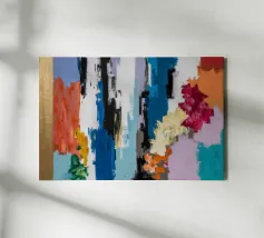 An abstract composition featuring dominant vertical strokes of blues, oranges, and reds, accented with white and shimmering gold glitter, creating a sense of dynamic downward flow.