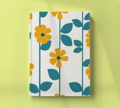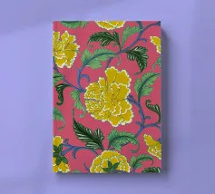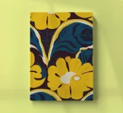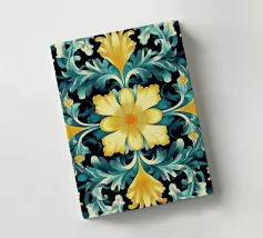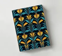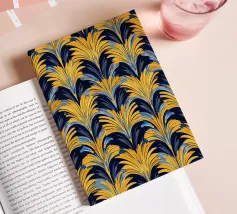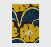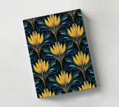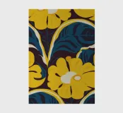 A bold and luxurious pattern of large, stylized golden yellow flowers set against a deep navy blue background. The high contrast and elegant forms create a timeless and sophisticated floral design.