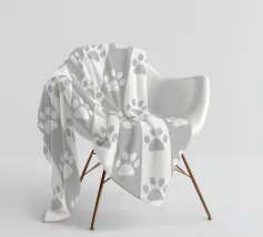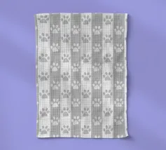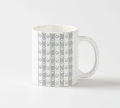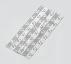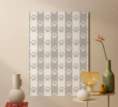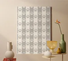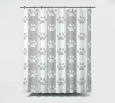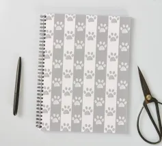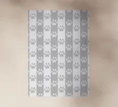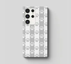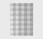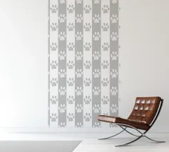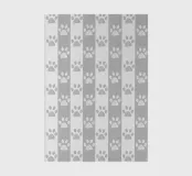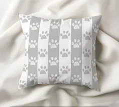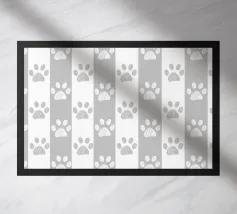 Grey and white stripe pattern with doodle paw prints. Seamless fabric design pattern