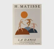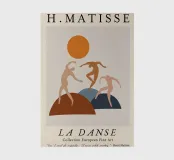 Immerse yourself in the iconic movement of Henri Matisse's "La Danse" with this inspiring digital poster. The design features three stylized, abstract figures in shades of warm beige and soft pink, dancing dynamically across organic, earth-toned and muted blue shapes, beneath a bright orange sun. This composition beautifully captures the energy and simplified forms characteristic of Matisse's work. The top proudly displays "H. MATISSE," with "LA DANSE" and "Collection European Fine Art" prominently at the bottom. A motivational quote by Henri Matisse, "Don't wait for inspiration. It comes whil