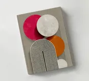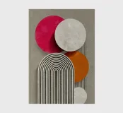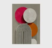 This abstract Bauhaus inspiration combines geometry and symmetry in a modern design. With white circles, semi-circles and stripes in grey, orange and pink, the illustration creates a harmonious interplay of colours. The retro striped architectural shapes give the artwork a minimalist and structured aesthetic.