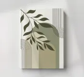 A leaf branch overlaps with geometric shapes, including arched lines and layered, muted tones. The combination creates a harmonious blend of nature and abstract design.