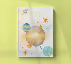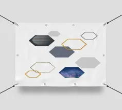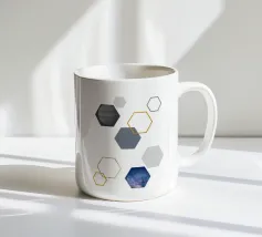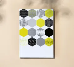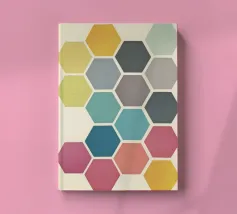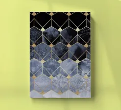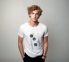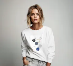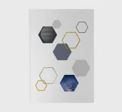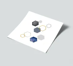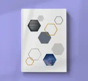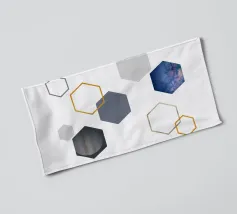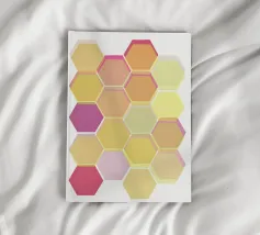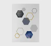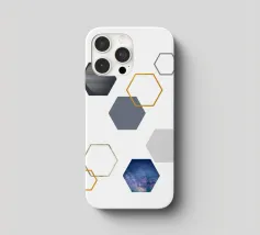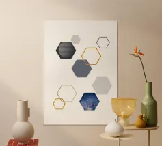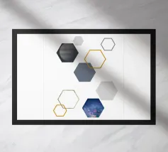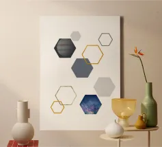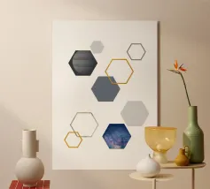 Hexagonal shapes of varying sizes feature different images, including a planet and a starry sky. The hexagons are arranged in a scattered pattern.