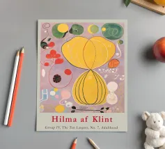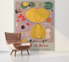 Explore the intricate beauty of Hilma af Klint's "Group IV, The Ten Largest, No. 7, Adulthood," presented as an evocative exhibition poster. This complex abstract work uses vibrant yellows, organic forms, and subtle numerical indicators to symbolize the multifaceted journey and interconnectedness of life during adulthood. Klint's pioneering spiritual and abstract vision is powerfully conveyed through her unique visual language and thoughtful composition. Our high-quality digital poster, at 7000x5000 pixels and 300 dpi, flawlessly reproduces the nuanced colors and profound symbolism, making it
