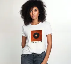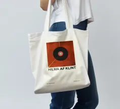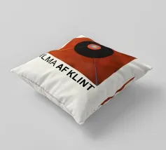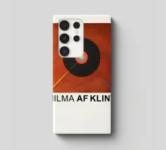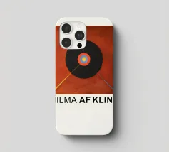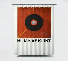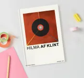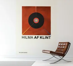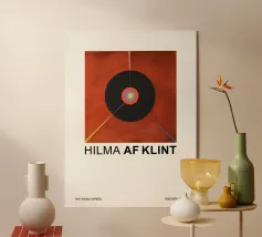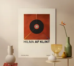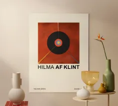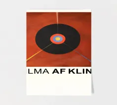 This striking art print features Hilma af Klint's abstract work from "The Swan Series," likely from 1915. The central motif is a powerful black circle, acting as a target, with concentric rings of red, yellow, and blue at its core. Three radiating lines in blue, yellow, and pink emanate from the center, all set against a rich, earthy red background. This piece embodies themes of spiritual focus, cosmic energy, and inner connection, characteristic of Klint's pioneering abstract art. The bold yet precise design makes it a captivating piece. This high-quality digital poster (7000x5000 pixels, 300