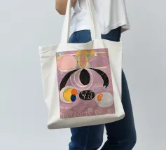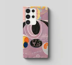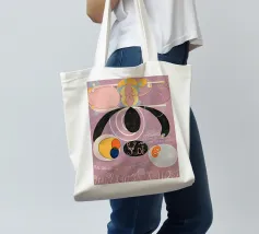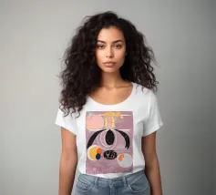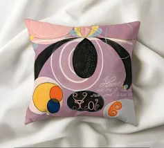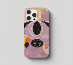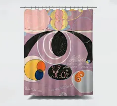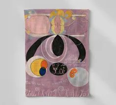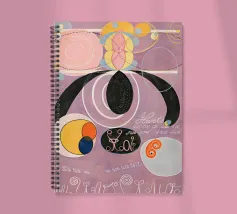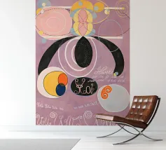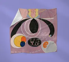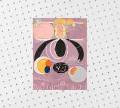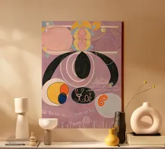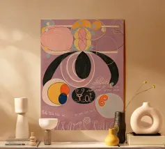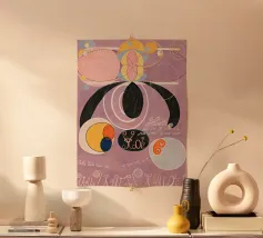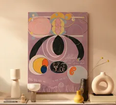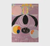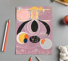 This mesmerizing art print features Hilma af Klint's "The Ten Largest, No. 6, Adulthood," a captivating abstract work rich with symbolic forms. The composition, set against a soft lilac background, includes prominent black arcs, concentric circles, and swirling lines in pink, yellow, blue, and orange. Organic shapes and intriguing script-like elements are also present, reflecting Klint's exploration of spiritual and scientific concepts. This high-quality digital poster (7000x5000 pixels, 300 dpi) beautifully captures the ethereal beauty and groundbreaking artistry of Klint's pioneering abstrac