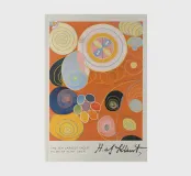 This vibrant art print features Hilma af Klint's "The Ten Largest (No.8)," a captivating abstract work from 1907. The composition is set against a warm orange background, filled with an intricate array of swirling spirals, concentric circles, and organic forms in a rich palette of yellows, blues, pinks, and purples. Signed "H. af Klint," this piece showcases Klint's pioneering spiritual and abstract vision, exploring themes of growth and interconnectedness. This high-quality digital poster (7000x5000 pixels, 300 dpi) beautifully captures the ethereal beauty and groundbreaking artistry of Klint