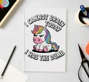 A cute unicorn with a rainbow mane sits surrounded by stars, accompanied by the humorous text "I cannot brain today, I has the dumb." The image is set against a plain background.