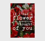 A visual poem of colour and emotion: bright red flowers against a lush green backdrop set the stage for the white lettering "If I had a flower for everytime I thought of you" - a line that hovers like a silent thought between nostalgia and affection. The composition thrives on the contrast between floral intensity and typographic clarity. It looks like a captured moment that is both personal and universal at the same time.