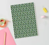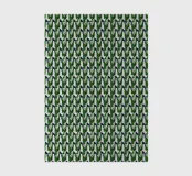 The image features a complex, repeating geometric pattern with interlocking shapes. A blend of green, black, and white dominates the composition, creating a visually dynamic effect.