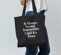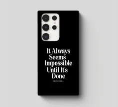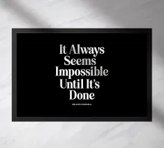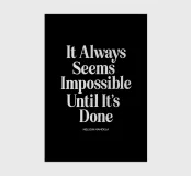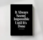 Elevate your space with this striking typography art print featuring Nelson Mandela's iconic words. The timeless message "It Always Seems Impossible Until It's Done" is rendered in crisp white retro serif lettering against a deep black background, creating a bold contrast that demands attention. This minimalist design offers a powerful reminder of perseverance and achievement, perfect for home offices, living rooms, or as a thoughtful gift. The classic typography and inspirational message make this print a versatile addition to any decor style, from modern to traditional.