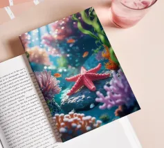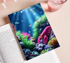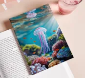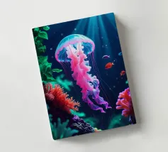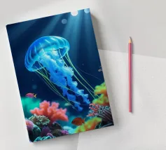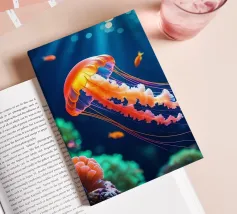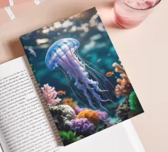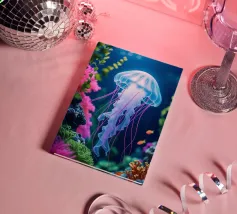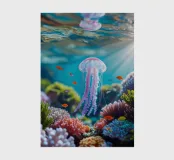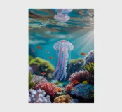 A graceful jellyfish floats gently just below the surface of the water, where sunbeams and reflections combine to form an enchanting dance. The coral gleams in soft colours, and the airy bokeh in the background gives it a dreamy look. A magical moment caught between light and depth. This digital illustration was created in a photo-realistic style, with an eye for light, detail and atmosphere. An ode to life underwater, depicted by Trinkets NL Design Studio and brought to life with the help of AI.