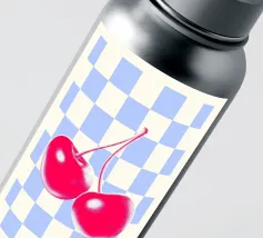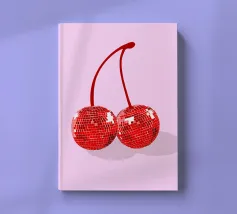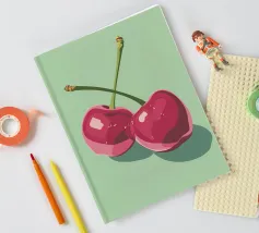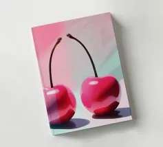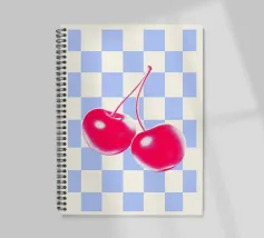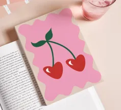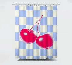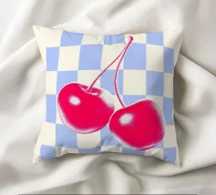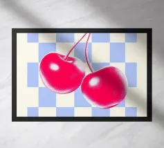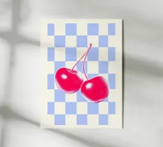 This minimalist illustration shows two sweet red cherries against a background with a white and light blue chequered pattern. The vibrant colours and simple design will bring the taste of summer to any kitchen. Ideal as a cheerful garden accent, this artwork celebrates the beauty and freshness of nature.