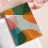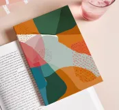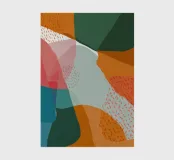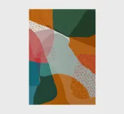 An abstract artwork features multiple layers of color and texture, with torn paper effects and dotted patterns in a palette of green, terracotta, and orange, creating depth and tactile interest.