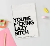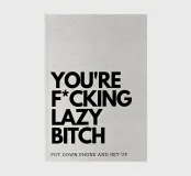 "The words YOU'RE F*CKING LAZY BITCH' are stacked in a bold, black sans-serif font, with the asterisk censoring the 'U' in 'FUCKING, followed by the phrase 'PUT DOWN PHONE AND GET UP' in a smaller, more delicate serif font, all set against a textured off-white background.",