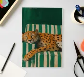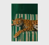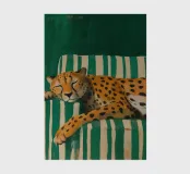 A serene and whimsical artwork of a cheetah peacefully napping on a vintage green-and-white striped sofa. The bold patterns and cozy posture of the big cat create a dreamy, humorous contrast between wild nature and relaxed domestic life. Perfect for animal lovers, eclectic art collectors, and fans of playful interior aesthetics.