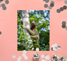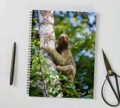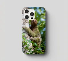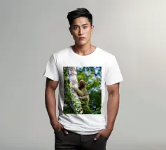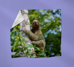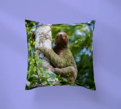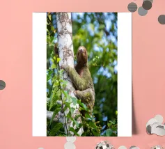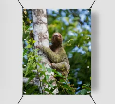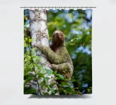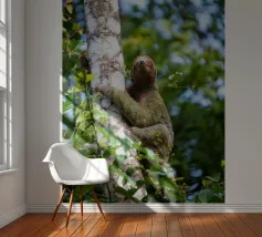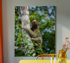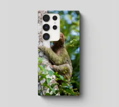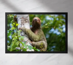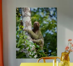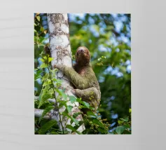 A sloth clings gently to a tree, basking under the warm glow of the summer sun. Sloths are humble, gentle creatures with a sinister appearance and demeanor.