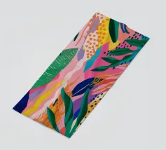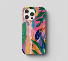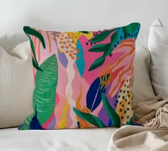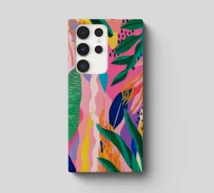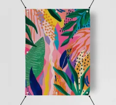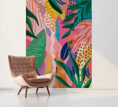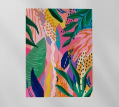 Elongated tropical leaves flow upward through a gentle pink glow, creating a secret vertical garden.