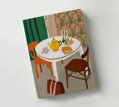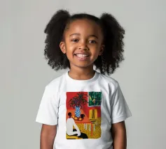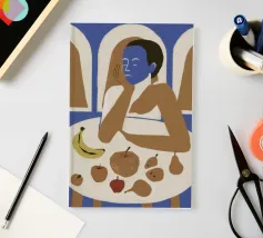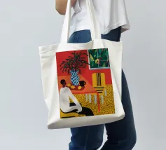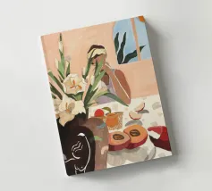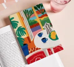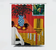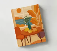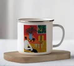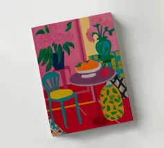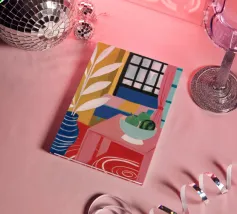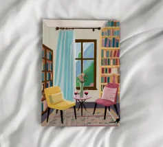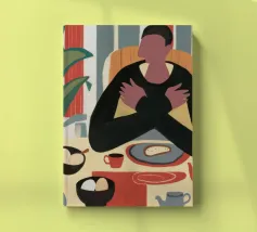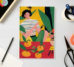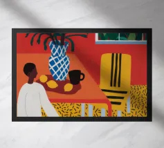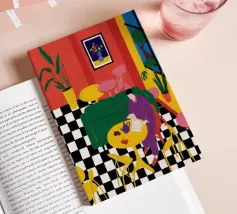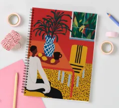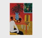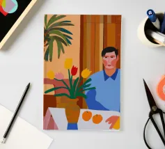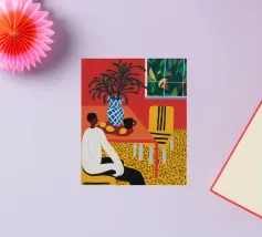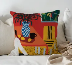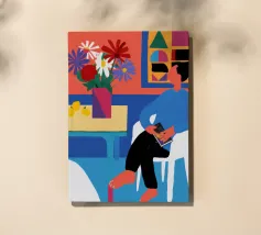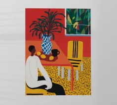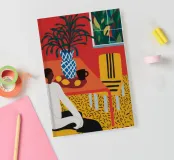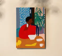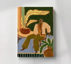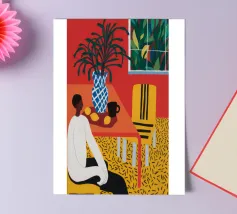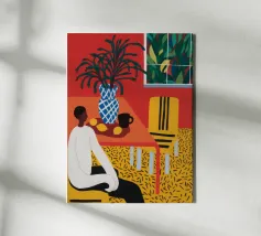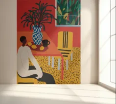 A scene of a person sitting on a leopard print rug, surrounded by plants and books. The composition is a colorful and eclectic celebration of quiet contemplation in a vibrant, modern, and personalized space.
