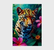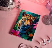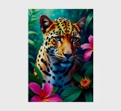 A striking leopard rests among vivid tropical flowers and lush greenery, glowing with color and light. The mix of photorealistic detail and painterly textures gives the scene a radiant, dreamlike energy. Perfect for maximalist interiors that celebrate bold contrasts and exotic beauty. Part of the Tropical Radiance series – a vibrant journey through tropical light and jungle magic. This digital illustration is created with attention to light, detail and atmosphere. Imagined by LUMAQUA Studio, visualized with the help of AI.